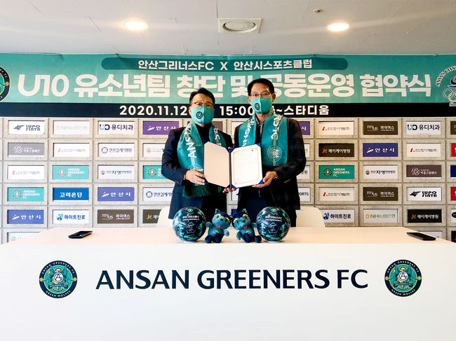 안산그리너스FC가 지역출신 우수선수 육성을 위해 지난 12일 오후 3시 와~스타디움 미디어룸에서 (사)안산시스포츠클럽과 U-10 창단 및 공동운영 협약을 체결했다.