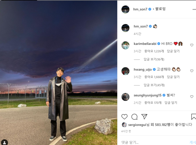 개인 SNS에 올라온 사진에서 손흥민은 올블랙의 깔끔한 패션과 환한 미소로 대표팀을 떠나 토트넘으로 돌아가는 모습을 보여줬다.