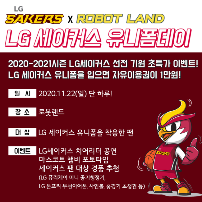 더불어 LG세이커스는 유니폼을 착용한 관람객 대상으로 LG 퓨리케어 미니 공기청정기, LG 톤프리 무선이어폰, LG세이커스 선수단 사인볼, LG세이커스 홈경기 초청권 등의 다양한 경품 추첨 이벤트를 준비해, 로봇랜드를 방문한 관람객들의 즐거움을 더할 예정이다.