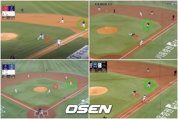정수빈은 1루쪽으로 몸을 이동하면서 번트를 대고, 투수와 1루 파울라인 사이 코스를 노린다. 수비쪽에서는 투수가 투구 후 기민하게 1루 파울라인으로 달려가 잡고, 1루수는 베이스를 지키고 있으면 아웃시킬 확률이 높다. LG 1루수 라모스의 위치가 정석이다. 1루수 경험이 적은 KT 강백호, NC 강진성은 번트 타구가 1루 라인을 따라 오면 공을 향해 달려나온다. /orange@osen.co.kr