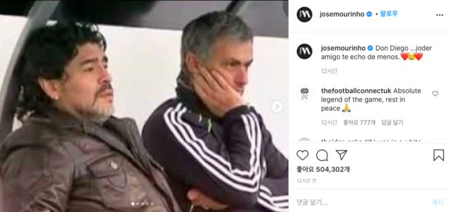 디에고 마라도나가 26일 별세한 뒤 무리뉴는 SNS에 마라도나와 함께 한 사진을 올렸다. 무리뉴는 “젠장 친구가 보고싶다”며 마라도나를 그리워했다. 무리뉴의 게시물은 50만개를 넘기며 사람들의 공감을 얻고 있다. / jasonseo34@osen.co.kr