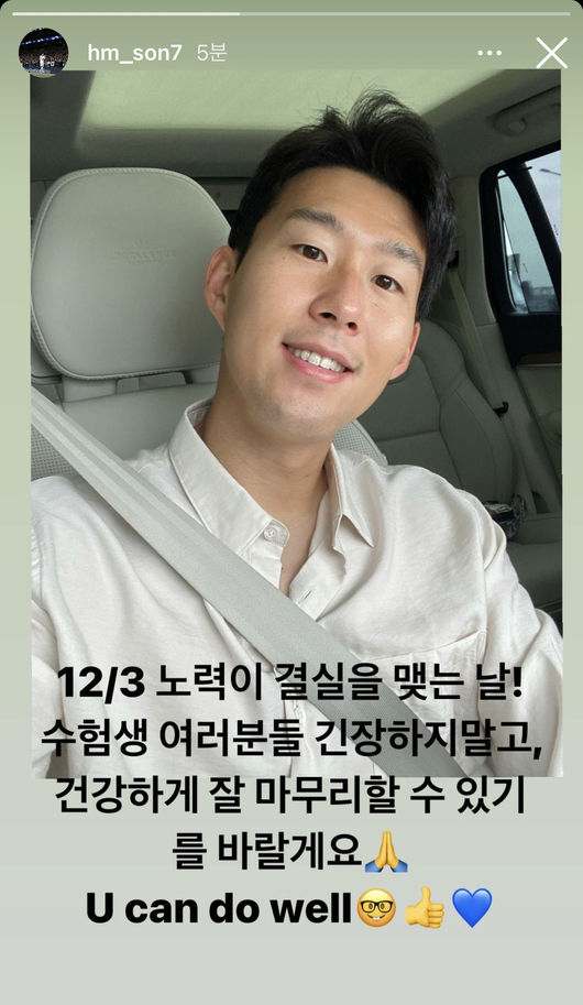 전날 SNS에서 손흥민은 "12월 3일은 노력이 결실을 맺는 날입니다"면서 "수험생 여러분들 긴장하지 말고, 건강하게 잘 마무리할 수 있기를 바랄게요. U can do well”라고 말했다.