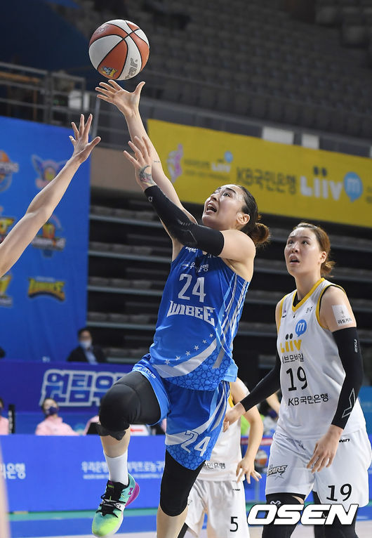 이날 김소니아는 박지수를 주로 상대하며 28점, 8리바운드를 쏟아내 완승을 거뒀다. 박지수보다 21cm 작은 김소니아는 그야말로 골리앗을 꺾은 다윗이었다. 박지수는 평소보다 저조한 15점, 11리바운드로 힘을 쓰지 못했다. / jasosneo34@osen.co.kr