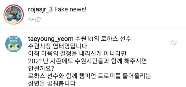 염태영 수원 시장은 7일 SNS를 통해 로하스 잔류 설득의 글을 게시했다. 염태영 시장은 로하스 남긴 글에 "수원 KT의 로하스 선수. 수원시장 염태영입니다"라며 "아직 마음의 결정을 내리신게 아니라면 2021년 시즌에도 수원 시민들과 함께 해주시면 안될까요. 로하스 선수와 함께 챔피언 트로피를 들어올리는 장면 꿈꿔봅니다"라고 글을 달았다.