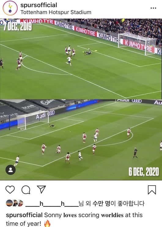 토트넘은 SNS를 통해 2골의 똑같이 비교했다. 그만큼 폭발적이라는 평가였다. 또 "손흥민은 매년 이맘 때 전 세계인들이 흥분할 수 있는 골 넣는 것을 추구한다"라며 칭찬을 아끼지 않았다. / 10bird@osen.co.kr