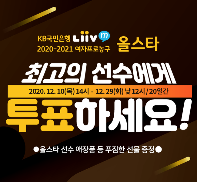 WKBL이 10일 오후 2시부터 29일까지 WKBL 공식 홈페이지를 통해 ‘KB국민은행 Liiv M 2020~2021 여자프로농구’ 올스타 팬 투표를 실시한다고 밝혔다.
