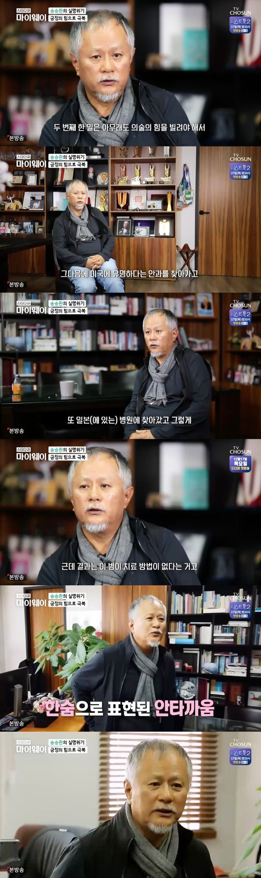 이날 '마이웨이' 송승환은 "늘 보던 휴대전화 메시지가 글자를 크게 해도 안 보이고, 앞에 있는 사람 얼굴이 점점 안갯속으로 들어가니까 처음에는 많이 당황했다"면서 안 좋아진 눈 상태를 언급했다. 이어 송승환은 "의술의 힘을 빌려야해서 서울과 미국, 일본에 유명하다는 병원과 안과를 찾아다니는 일로 오랜 시간을 보냈다"면서 "결과는 치료 방법이 없다는 거다. 그때부터는 안 보이는 가운데서도 '일할 수 있는 방법을 찾자'해서 화면을 좀 크게 볼 수 있는 여러가지 기구들도 개발하고 보지 못하면 들을 수 있는 IT 기술은 뭐가 있는지 찾아다니면서 습득했다"고 그간의 근황을 밝혔다.