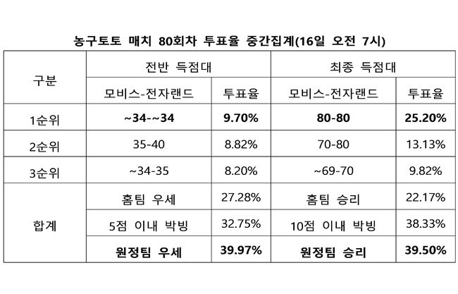 2020-21시즌 KBL 모비스-전자랜드전 대상 농구매치 80회차 중간집계 결과