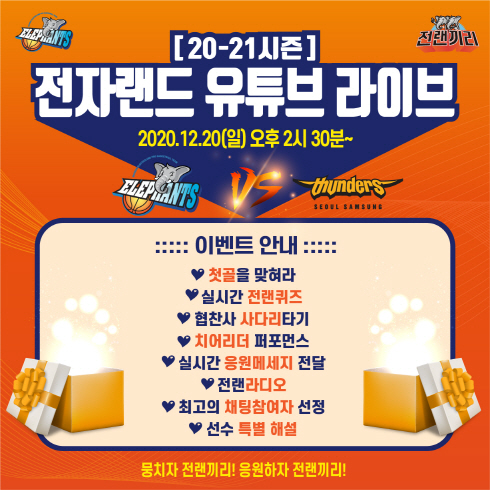 .한편, 전자랜드 엘리펀츠의 유튜브 라이브 방송은 누구나 참여할 수 있으며, 전자랜드 유튜브 ‘전랜끼리’에서 경기 당일(20일) 오후 2시 30분부터 참여 가능하다.