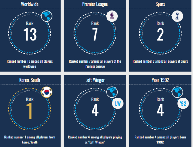 1992년생 순위에서도 손흥민은 4위로 평가됐다. 그보다 높은 위치에 위치한 동갑내기 축구 선수는 네이마르, 마네, 살라 순이었다.