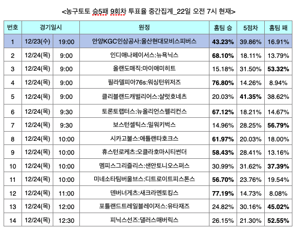 국민체육진흥공단이 발행하는 체육진흥투표권 스포츠토토의 수탁사업자 스포츠토토코리아(대표 김용민)가 오는 12월 23일(수)과 24일(목) 사이에 벌어지는 미국프로농구(NBA) 13경기와 국내남자프로농구(KBL) 1경기 등 총 14경기를 대상으로 한 농구토토 승5패 9회차 투표율을 중간 집계한 결과, 덴버-새크라멘토(12경기)전에서 홈팀 덴버가 77.19% 승리 예상 지지를 받았다고 전했다.