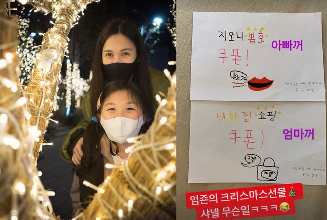 엄태웅, 윤혜진 부부의 딸 엄지온은 다가오는 크리스마스를 맞이해 자신만의 특별한 선물을 준비했다. 윤혜진이 공개한 사진에 따르면 엄지온은 엄태웅에게는 뽀뽀 쿠폰을, 윤혜진에게는 백화점 쇼핑 쿠폰을 선물했다.