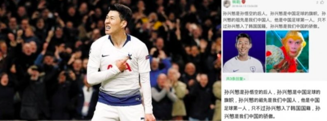 일언반구 반박할 가치가 없는 말이지만 실제 중국인들이 이렇게 믿고 싶어한다는 것이 문제다. 중국 네티즌들은 “맞다! 손흥민은 손오공의 후예다. 중국혈통이 맞다”, “손흥민을 중국대표팀 선수로 영입해야 한다”는 근거없는 댓글을 달았다. 중국팬들이 ‘좋아요’를 눌러서 해당 기사가 폭발적인 관심을 끌고 있다.