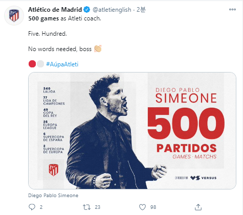 경기 후 아틀레티코 SNS는 "시메오네 감독의 통산 500번째 경기였다. 어떤 찬사도 부족하다"라고 시메오네 감독을 기렸다. /mcadoo@osen.co.kr