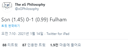 xG 지표는 평균적인 결정력이라면 기록할 수 있는 예상 득점이다. The xG Philosophy는 "손흥민은 xG 지표는 1.45골이다. 이는 풀럼 전체의 xG(0.99)에 비해 높은 것이다"고 지적했다.