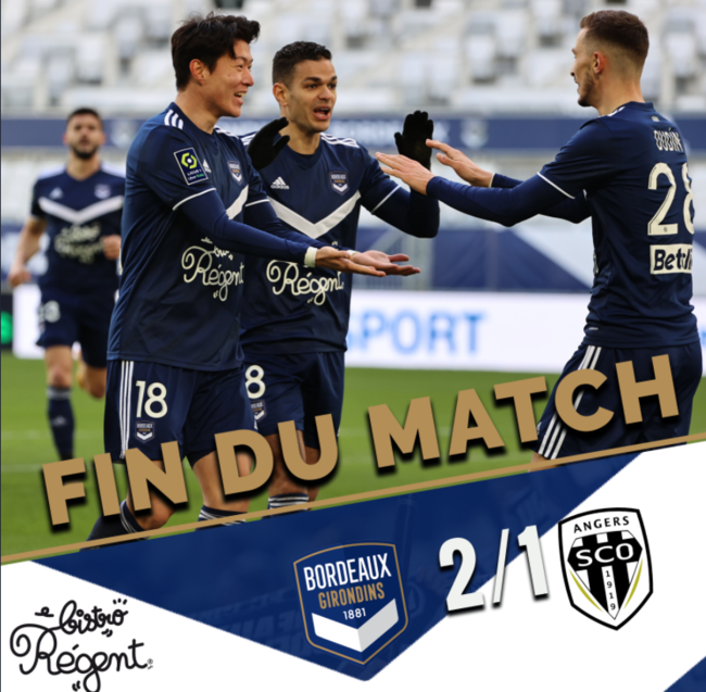 보르도는 24일(한국시간) 오후 9시부터 프랑스 보르도에 위치한 스타드 마트뮈 아트란티크에서 열리는 앙제와 2020-2021 프랑스 리그1 21라운드 경기에서 전반 11분만에 완성한 황의조의 멀티골로 2-1 승리를 거뒀다.