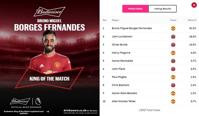 비록 이날 패배를 당했지만 팬들은 브루노 페르난데스를 최고 선수라고 뽑았다. 프리미어리그 사무국은 홈페이지를 통해 'King of the match'를 선정했다. 팬들 투표로 이뤄지는 것으로 페르난데스는 무려 51.3%의 선택을 받았다. 2위인 존 룬스트럼(18.4%)를 크게 앞섰다.