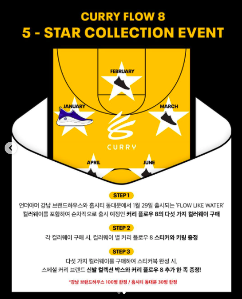 언더아머 코리아에 따르면 29일부터 강남 브랜드하우스 및 훕시티에서 커리8 신상을 구매하면 커리 플로우 8 스티커와 컬러웨이별 키링 등 다양한 사은품이 제공된다고 한다. 앞으로 발매되는 커리8 시리즈 5가지 컬러를 다 모으는 120명에게 스페셜 커리 브랜드 신발 컬렉션 박스와 커리8 농구화 보너스 한 켤레가 추가로 지급된다. 사은품이 조기에 매진될 수 있기에 구매를 서둘러야 할 전망이다.