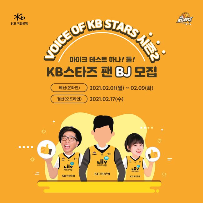 청주 KB스타즈(구단주: 허인)가 ‘VOICE OF KB STARS 시즌2’ 이벤트를 통해 구단 편파중계 BJ를 선발한다고 1일 밝혔다.