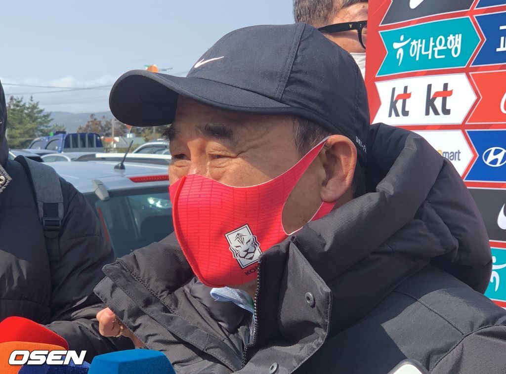 도쿄올림픽을 위해 옥석가리기에 집중하고 있는 김학범 감독은 목소리가 쉬었다. 바람이 많이 부는 날씨에도 선수들을 냉정하게 평가한 모습.