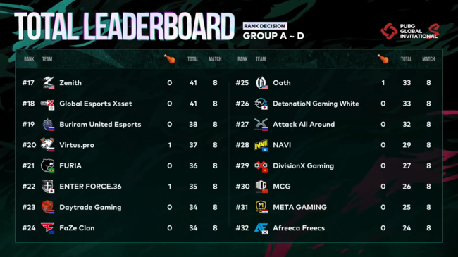 아프리카는 6일 오후 인천 영종도 파라다이스시티 스튜디오파라다이스에서 벌어진 '2021 펍지 글로벌 인비테이셔널(이하 PGI.S)' 순위결정전 2일차 B-C조 경기서 4번의 매치서 5점만을 추가하면서 24점으로 전체 팀들 중 최하위로 주저앉았다. 1일차 순위는 19점을 얻어 29위.