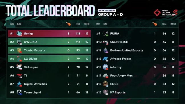 아프리카는 7일 오후 인천 영종도 파라다이스시티 스튜디오파라다이스에서 벌어진 ‘2021 펍지 글로벌 인비테이셔널(이하 PGI.S)’ 순위결정전 3일차 B-D조 경기서 도합 32점(24킬)을 획득하면서 총점 56점으로 순위결정전을 마무리했다. 현재 12위인 아프리카는 A-C조의 결과에 따라 직행에 실패할 가능성이 크다. 담원은 총점 112점으로 사실상 본선 직행을 확정했다.