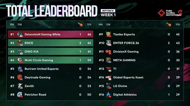 담원은 14일 오후 인천 영종도 파라다이스시티 스튜디오파라다이스에서 벌어진 ‘2021 펍지 글로벌 인비테이셔널(이하 PGI.S)’ 하위권 순위결정전 1주 2일차 경기를 총점 61점으로 끝냈다. T1은 순위결정전을 13위로 마무리하면서 가까스로 ‘위클리시리즈’에 나설 수 있게 됐다.