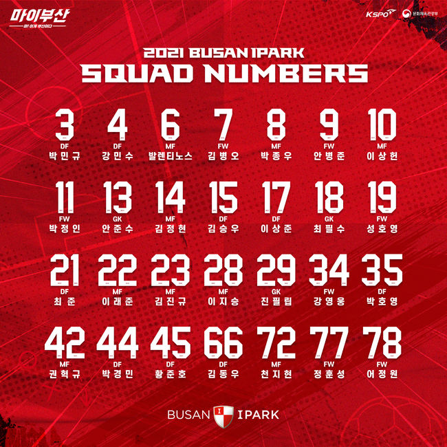 2021시즌 부산아이파크 선수단 배번이 확정됐다. 부산은 2021시즌 ‘뉴빌딩’을 위해 안병준, 이상헌, 최준, 박정인 등을 영입하며 새로운 시즌 준비에 박차를 가하고 있다.