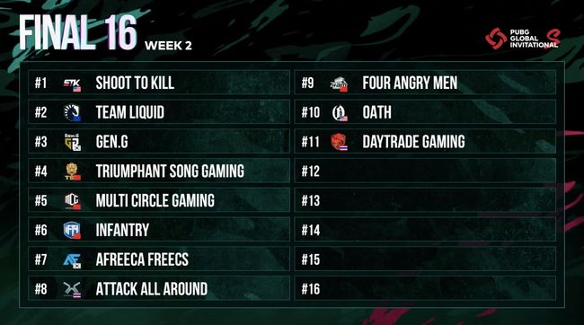 아프리카와 함께 2주 2일차에서 ‘위클리 파이널’ 진출에 성공한 팀은 총 5팀이다. 인팬트리, AAA, 4AM, 오쓰, 데이트레이드가 주인공이다. 이로써 1일차에서 ‘위클리 파이널’ 명단에 이름을 올린 슛투킬, 팀 리퀴드, 젠지, TSG, MCG를 포함해 총 11팀이 확정됐다.