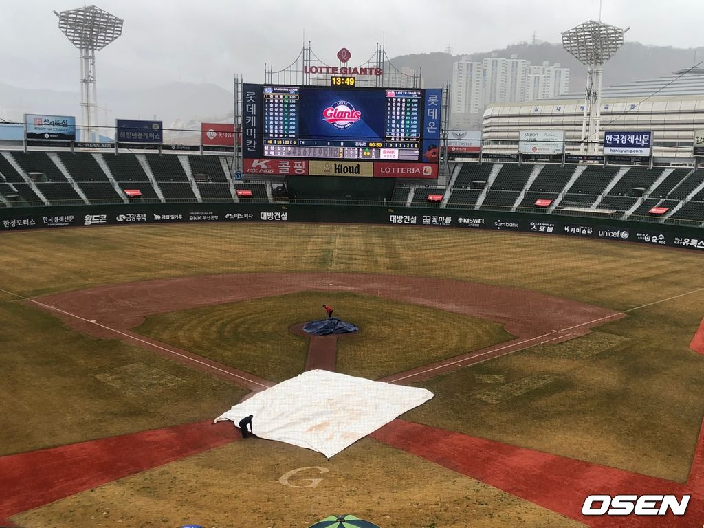 1일 부산 사직구장에서 열린 롯데와 삼성의 첫 연습경기는 강한 빗줄기로 인해 우천 취소됐다. 삼성이 2-0으로 앞서던 3회초에 취소 결정이 내려졌다.