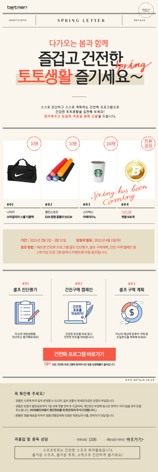 국민체육진흥공단이 발행하는 체육진흥투표권 스포츠토토의 공식 온라인 발매사이트 베트맨(www.betman.co.kr)이 2021년 3월 건전화 이벤트인 ‘다가오는 봄과 함께 즐겁고 건전한 토토생활 즐기세요~’를 1일부터 실시한다.