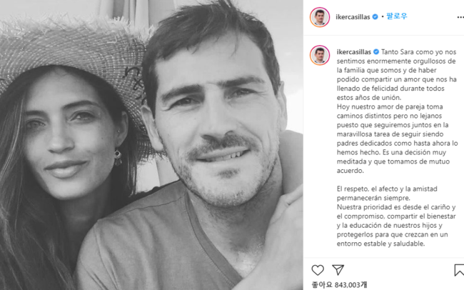레알 마드리드의 전설 이케르 카시야스는 13일(한국시간) 자신의 SNS를 통해 아내 사라와 이혼설에 대해서 인정했다.