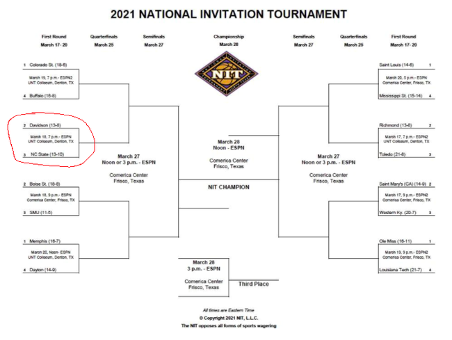 명문대학팀들에게는 NCAA 토너먼트에 탈락해 NIT에 초청받는 것이 일종의 굴욕으로 여겨진다. 하지만 데이비슨같은 미드메이저 컨퍼런스 소속 대학에게는 전국구로 이름을 알릴 수 있는 또 하나의 좋은 기회다.