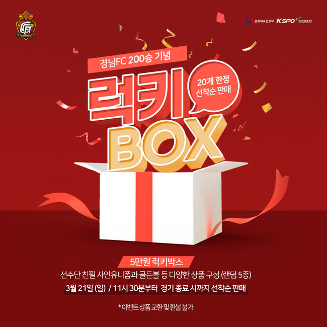경남FC가 21일 창원축구센터에 열리는‘하나원큐 K리그2 2021’서울이랜드FC와의 경기에서 통산 200승을 기념하여 팬들을 위해 메가스토어 럭키박스 판매와 경품 이벤트를 진행한다.