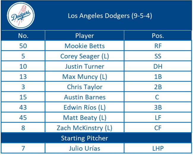 다저스는 이날 선발 라인업으로 무키 베츠(우익수) 코리 시거(유격수) 저스틴 터너(지명타자) 맥스 먼시(1루수) 크리스 테일러(2루수) 오스틴 반스(포수) 에드윈 리오스(3루수) 맷 비티(좌익수) 잭 맥킨스트리(중견수)가 나선다. 1~4번만 주전이고 5번 테일러 부터 올 시즌 백업 요원이다. 좌타자는 시거, 먼시, 리오스, 비티, 맥킨스트리 5명이 포함됐다. 다저스 선발은 훌리오 유리아스.