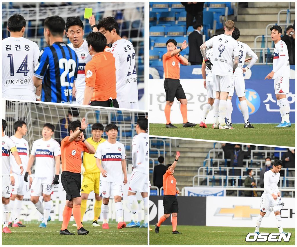 지난 17일 인천에서 열린 인천과 수원FC의 경기. 하나원큐 K리그1 20201 5라운드 경기에서 수비수 박지수의 두 차례 핸드볼 반칙 중 하나를 무효로 처리했다. 심판위원회는 사후 평가에서 오심을 선언했다. 수비수에 대한 핸드볼 판정의 경우 고의성을 따지는데 의도적인 행동이 아니라고 본것이다.