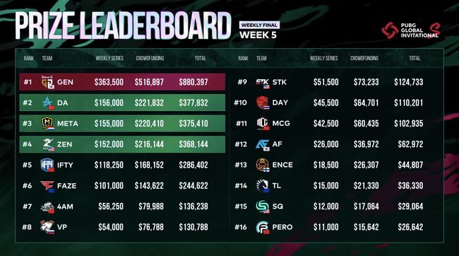 5주차 우승으로 젠지는 상금 순위에서 압도적인 1위에 올랐다. 2위 DA와 50만 달러 이상의 격차를 냈다. 젠지가 마지막 6주차도 활약하면서 2021 PGI.S 최종 우승을 거머쥘 수 있을지 주목해본다.
