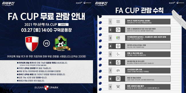 부산은 지난 시즌부터 구덕운동장 내 방역 지침을 철저히 준수하며 안전한 홈경기를 치러왔다. 이번 FA CUP 경기에서도 동일한 방역을 진행할 예정이다. 이번 경기 또한 현장에서 혼란을 최소화하기 위해 공식 카카오톡으로 입장권 쿠폰을 발행할 예정이다. 무료 관람을 원하는 사람은 미리 부산아이파크 카카오톡 채널을 추가한 후 쿠폰을 발급받는 것을 권장한다. FA CUP 경기를 통해서도 부산 구단과 부산 시민은 안전한 시민 의식을 보여주는 계기가 될 듯 하다.