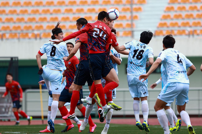이후 김천이 핸드볼 파울로 페널티 킥을 내줬지만 최철원 골키퍼의 선방으로 위기를 넘겼다. 분위기를 완전히 가져온 김천은 전반 29분, 골 포스트를 맞고 나온 공을 정재희가 헤더로 밀어 넣으며 3-0으로 전반을 마쳤다.