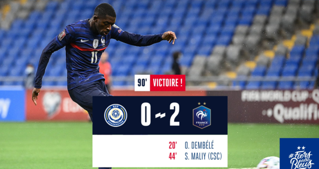프랑스는 29일(한국시각) 카자스흐탄 누르 술탄에 있는 아스타나 아레나에서 끝난 2022년 국제축구연맹(FIFA)카타르월드컵 유럽지역예선 D조 2차전 카자흐스탄 원정 경기에서 2-0 승리를 거뒀다.