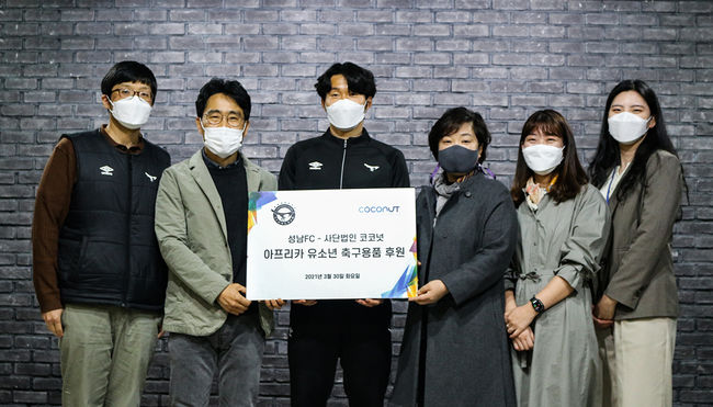 성남은 30일 구단 사무국에서 사단법인 코코넛과 축구용품 기부를 위한 전달식을 가졌다. 이 자리에는 사단법인 코코넛 서영란 상임이사와 성남FC 박재일 사무국장, 이창용 선수 등 관계자 10여 명이 참석하였다. 기부된 용품들은 축구공과 유소년용 유니폼 등 1,500만 원 상당으로 아프리카 아이들을 위해 사용될 예정이다.