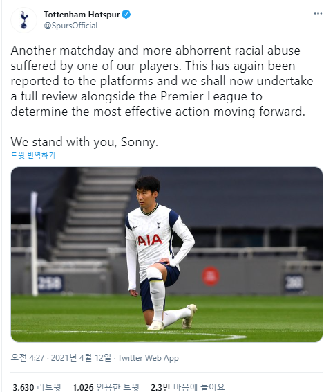 경기 후 토트넘은 공식 SNS는 "우리 선수인 손흥민이 경기 후 끔찍한 인종 차별을 겪었다. 우리는 리그 사무국과 함께 효과적으로 대처할 것이다"라고 강조했다.