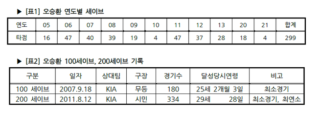 지난 2005년 4월27일 대구 시민구장에서 열린 LG전에서 첫 세이브를 올린 오승환은 이후 KBO 리그 세이브 관련 기록에 빠지지 않고 등장하고 있다.