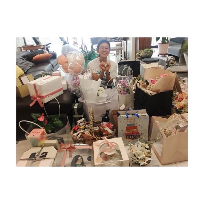 사진에는 팬들로부터 받은 생일 선물을 인증하고 있는 김희애의 모습이 담겼다. 민낯의 자연스러운 상태이지만 촉촉한 물광 피부가 빛나고 있다.