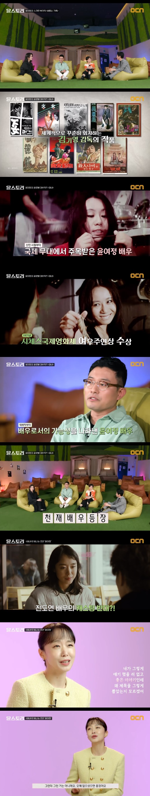 이날 영화평론가 주성철, 영화 '찬실이는 복도 많지'의 감독 김초희, 배우 김영민이 윤여정에 관한 이야기를 나눴다. 주성철 감독은 "김기영 감독 화녀로 데뷔했다. 신인상, 여우주연상을 동시에 수상했다. 당시 천재 배우가 등장했다며 난리였다"라고 설명했다.