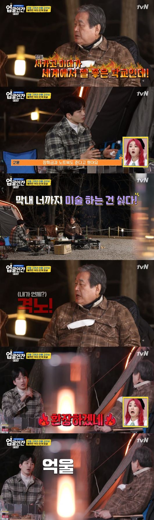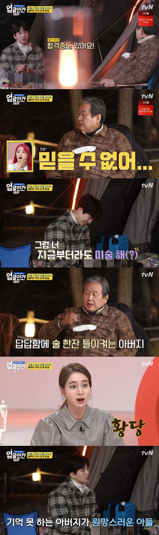 24일에 방송된 tvN '자발적 불편 챌린지 업글인간'에서는 고윤과 김무성 부자가 함께 캠핑에 나서 속 마음을 나눴다.