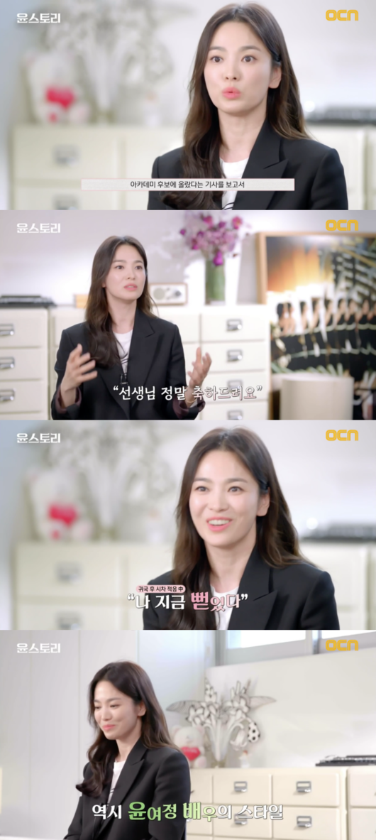송혜교는 윤여정이 아카데미 여우조연상 후보로 올랐을 때 나눈 대화를 공개했다. 송혜교는 “아카데미 후보에 올랐다는 기사를 보고 닭살이 돋을 만큼 너무 좋은 거다”고 전했다.