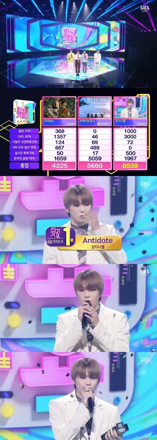 25일 오후 방송된 SBS '인기가요'에서는 샤이니의 'Atlantis', 브레이브걸스의 '롤린', 강다니엘의 'Antidote'가 1위 후보로 경쟁했다.