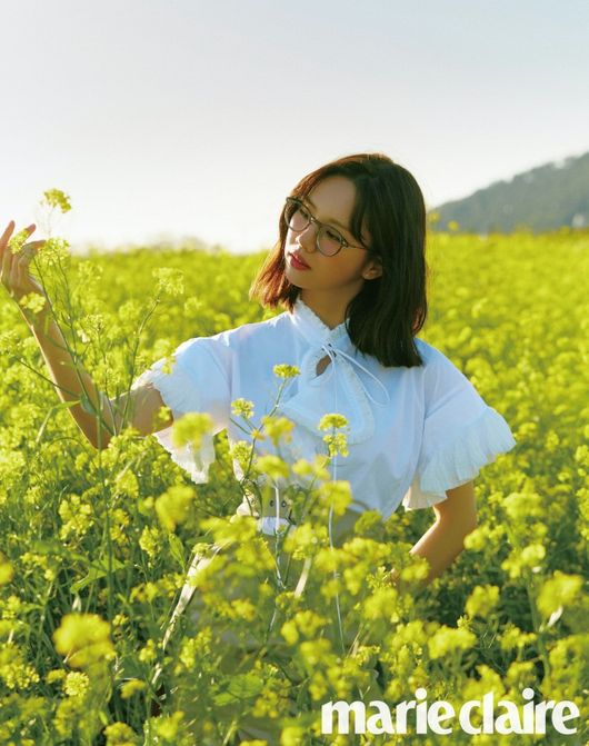 또 흐드러지게 핀 신화가든의 유채꽃밭을 배경으로 화이트 러플 셔츠와 베이지 스커트에 까만 뿔테 안경을 믹스 매치함으로써 ‘역시 혜리’라는 스태프들의 찬사를 받았다는 후문이다.