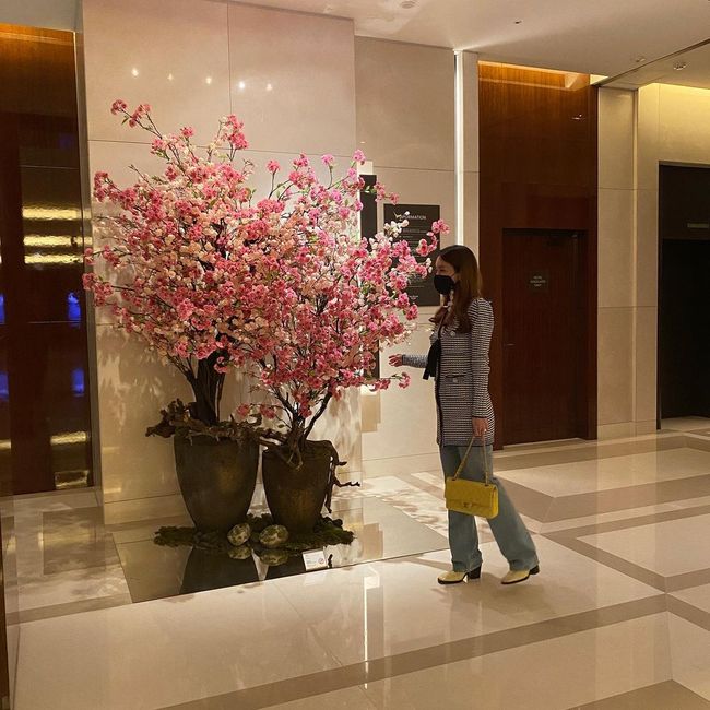사진 속 김정은은 플라워 패턴의 마스크 줄을 착용한 채 핑크빛 컬러가 인상적인 꽃 앞에서 포즈를 취하고 있는 모습. 김정은은 특유의 청순함을 극대화한 긴 생머리와 명품 패션 소품을 매치하면서 고급스러운 매력까지 자아냈다.